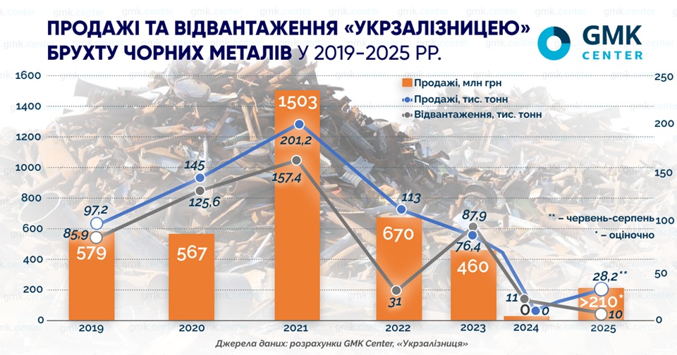 Через зриви торгів під питанням виконання планів «Укрзалізниці» щодо реалізації металобрухту за підсумками 2025 року. УЗ прагне зайняти в поточному році 8% ринку споживання брухту в Україні, що становить приблизно 96 тис. т за прогнозованого рівня споживання сировини у 2025 році на рівні 1,2 млн т (очікування асоціації «УАВтормет»). За червень-серпень УЗ продала 28,2 тис. т брухту, що дорівнює 1,8% від очікуваного споживання в поточному році.